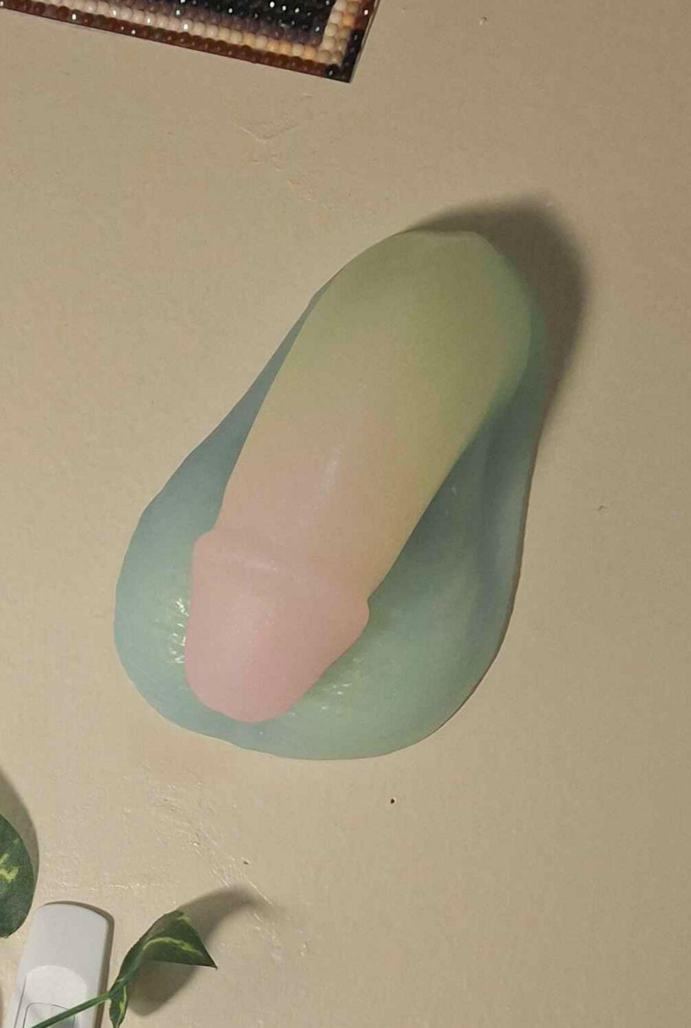 My first thought upon opening the package was well damn, that's a lot of meat. It's my biggest packer, and a ludicrously sized piece of weiner compared to my five foot 2 and a half inch frame. The shape's interesting, too- there's this slightly yet distinctly conical shape to the shaft I didn't quite register before I got it which has the base of the shaft a good bit thicker than near the tip. The entire base of the packer's distinctly wider than any of my other packers, and as I suspected, it didn't fit in the packing pocket of my RodeOh Shift boxers.HOWEVER. I, being in the middle of a shopping run, decide, fuck it, and promptly smoosh the thing entirely against my skin.And it works. Yes, my dear ladies, gents, and those of us who know better- we ball, as we have been balling. I'm going to need some sort of packing pouch for this thing, but for the time being,the fact that its balls are mostly just the outsides with the rest being scooped out is both why I couldn't fit it in the boxers the proper way and why it works so well as they are right now. In summary: it's pretty big, I reccommend it if you're taller than me but if you're also a short king, join me in being the most well endowed motherfucker in the cvs.And, yes, I stuck it to my wall. The curved back is kinda suction-cuppy. :D